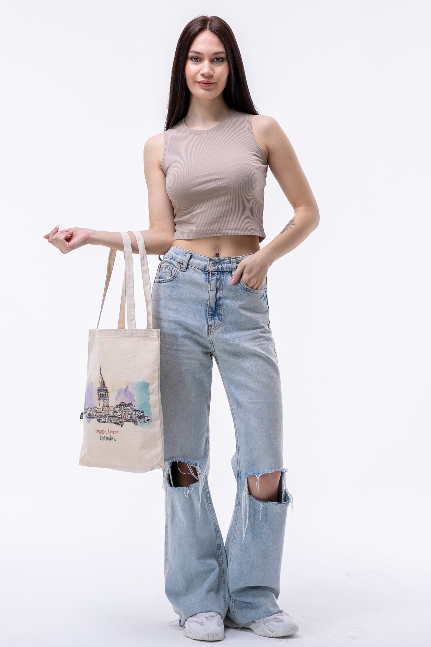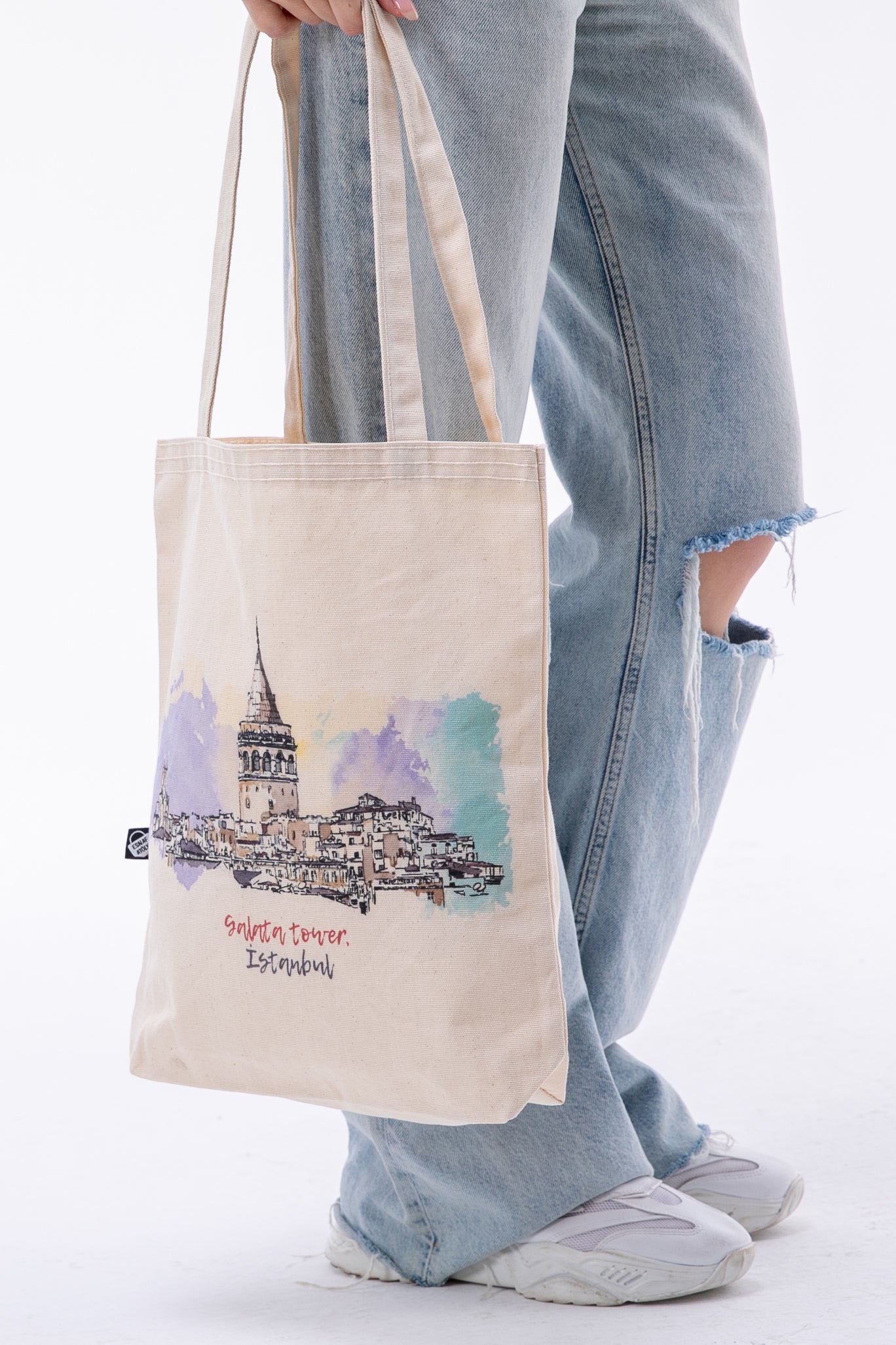 İstanbul Galata Tower Baskılı 340gr Gabardin Kumaş 35x40x8cm Bez Çanta