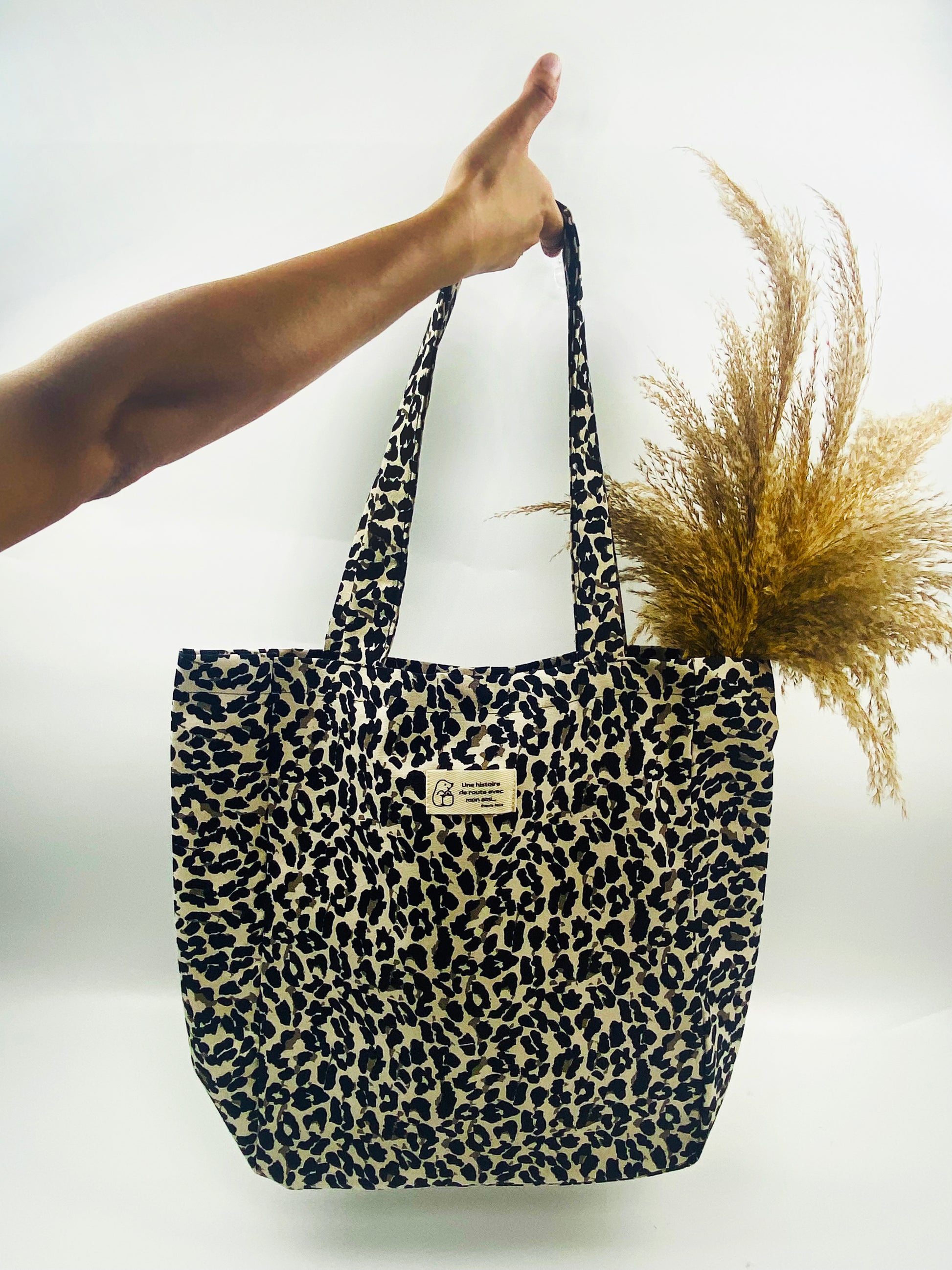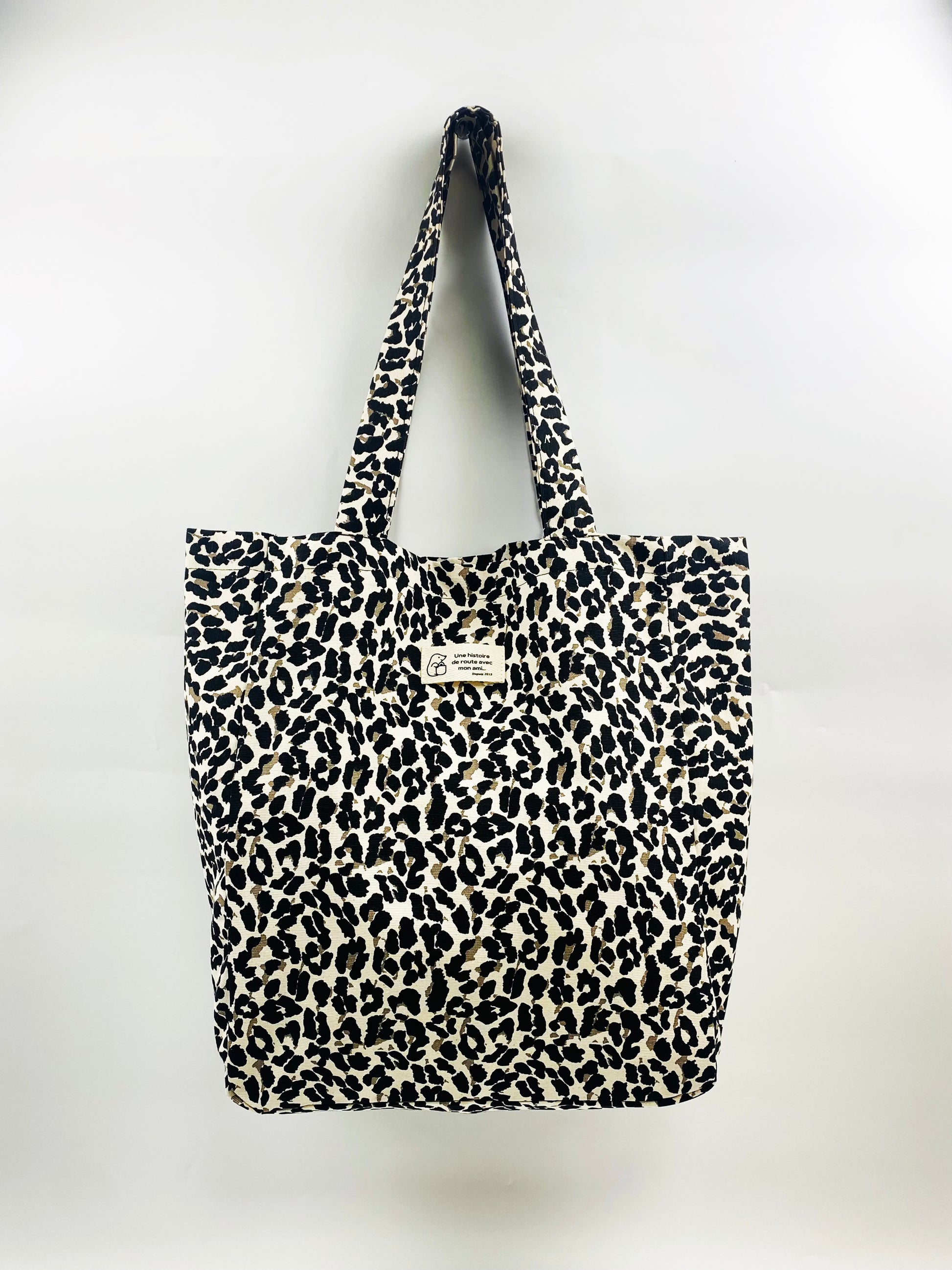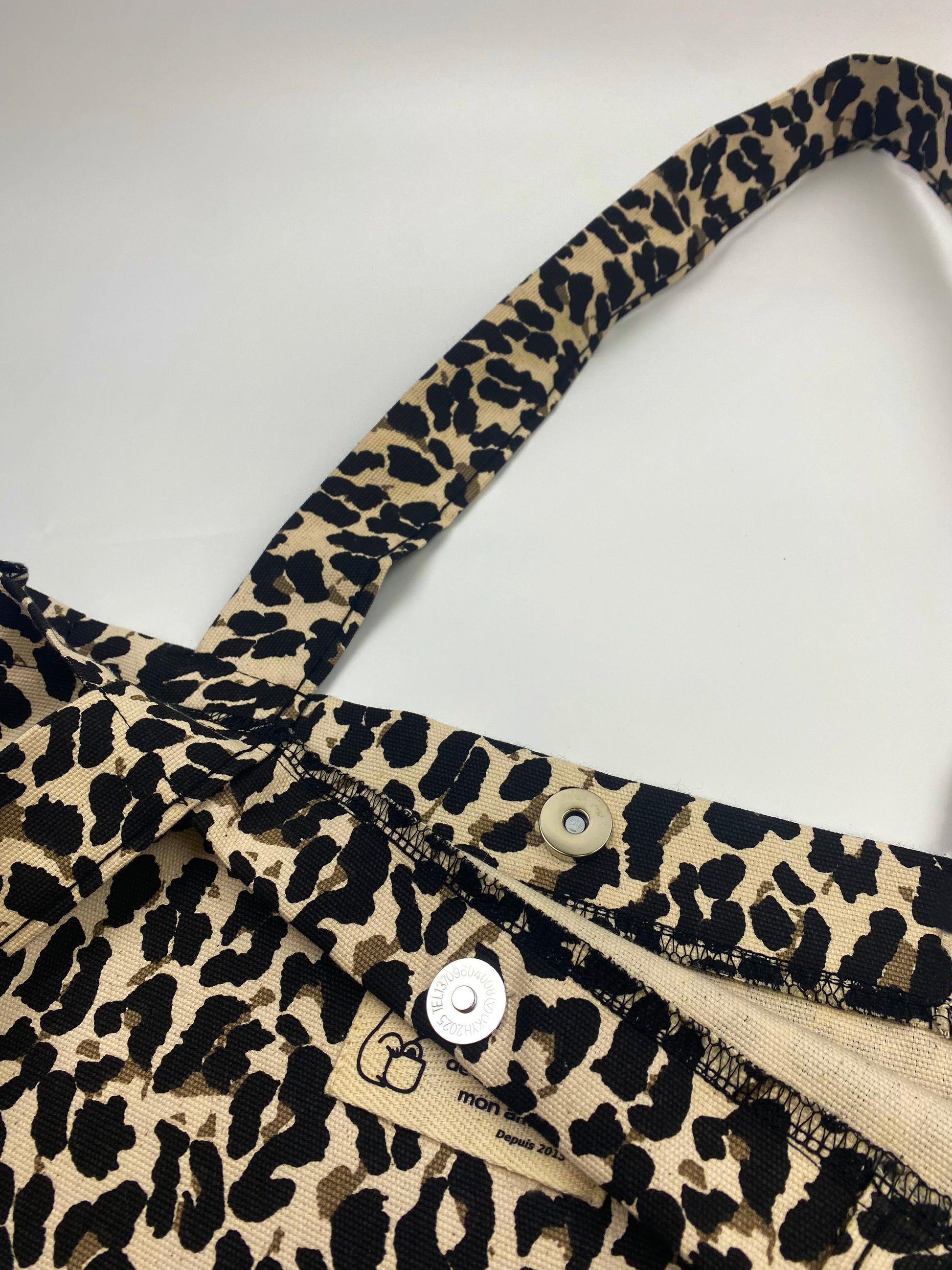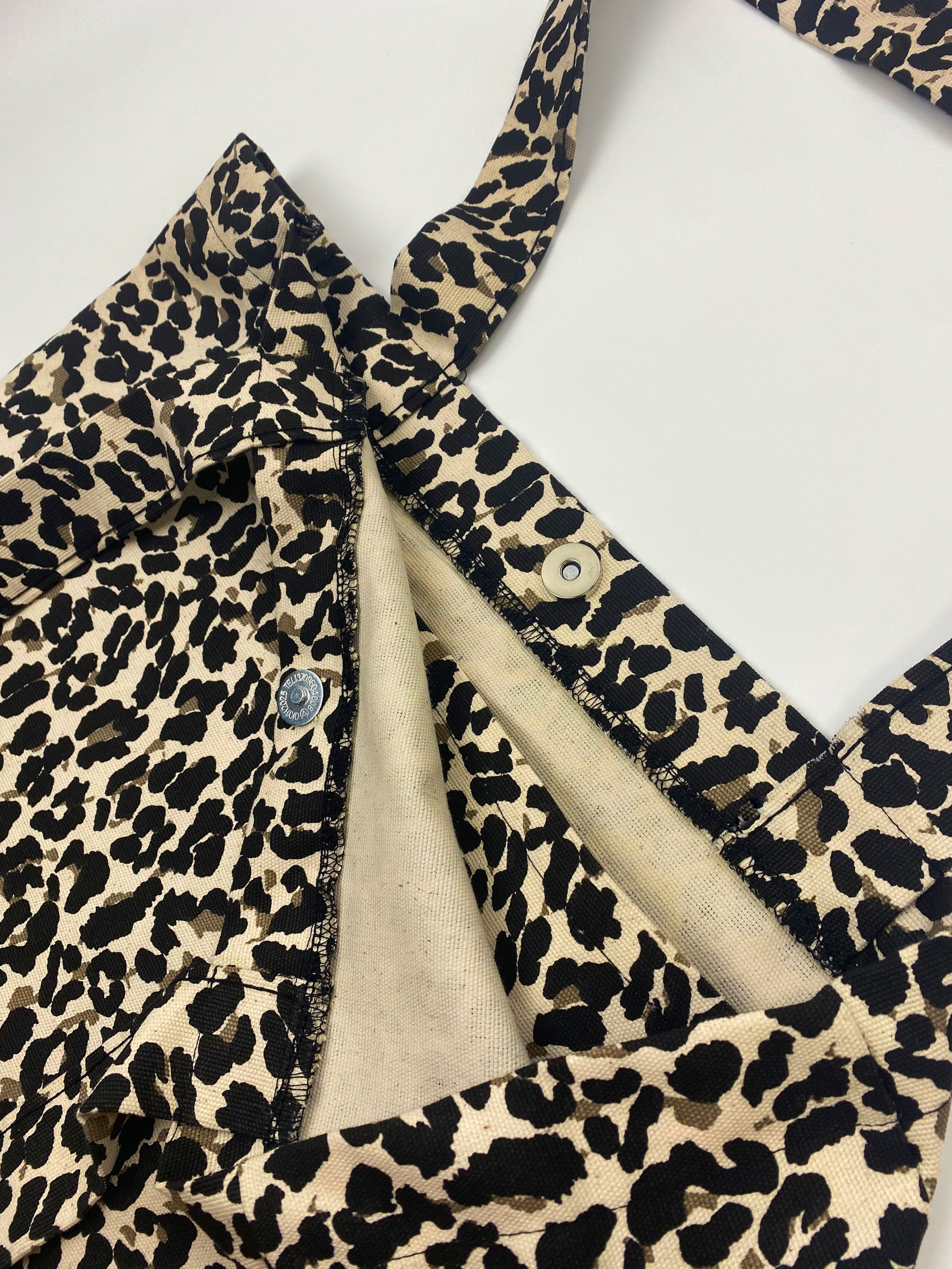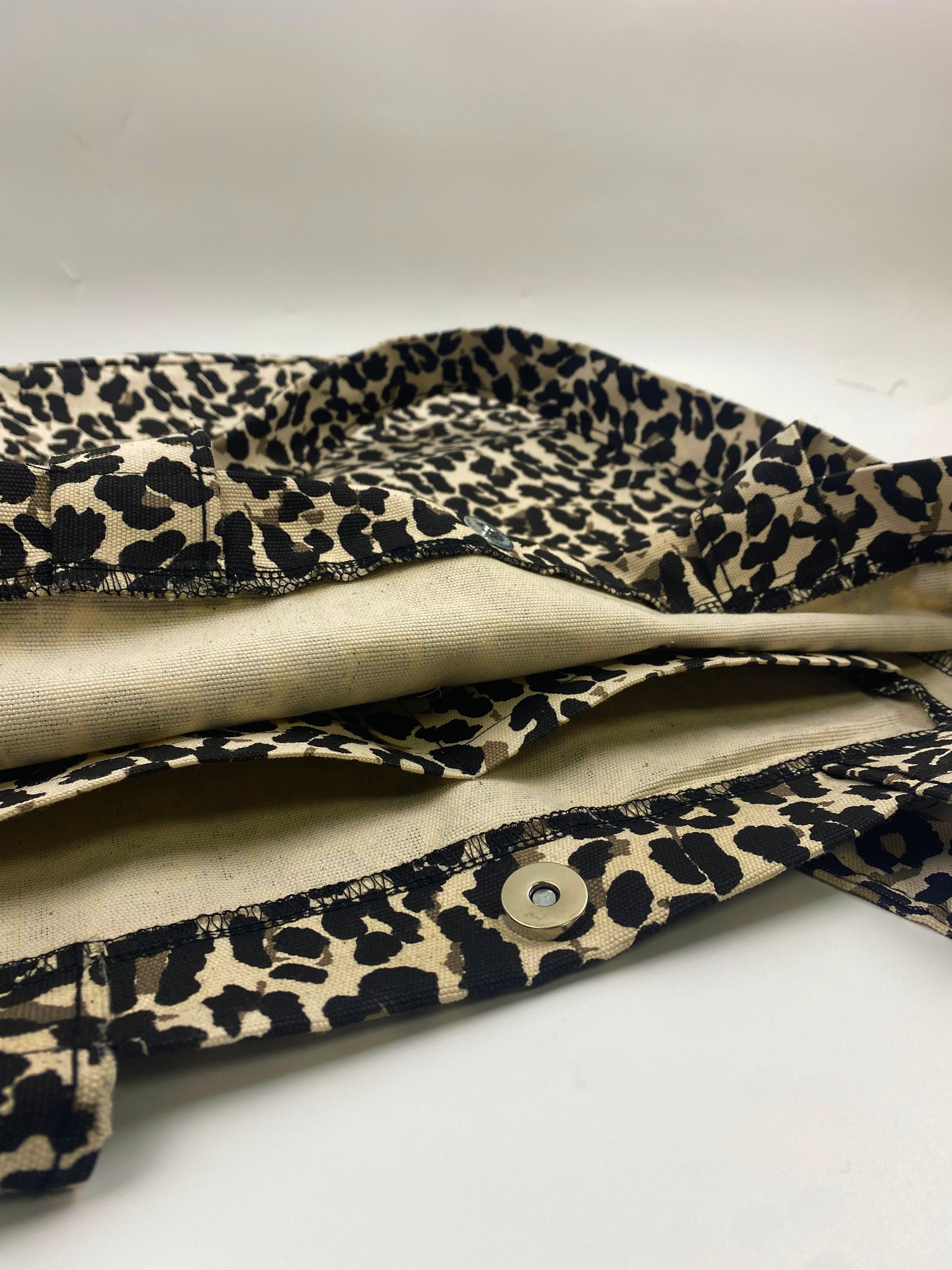 • Şık ve modern tasarımıyla her kıyafetle uyum sağlayan leopar desenli kanvas bez çanta.