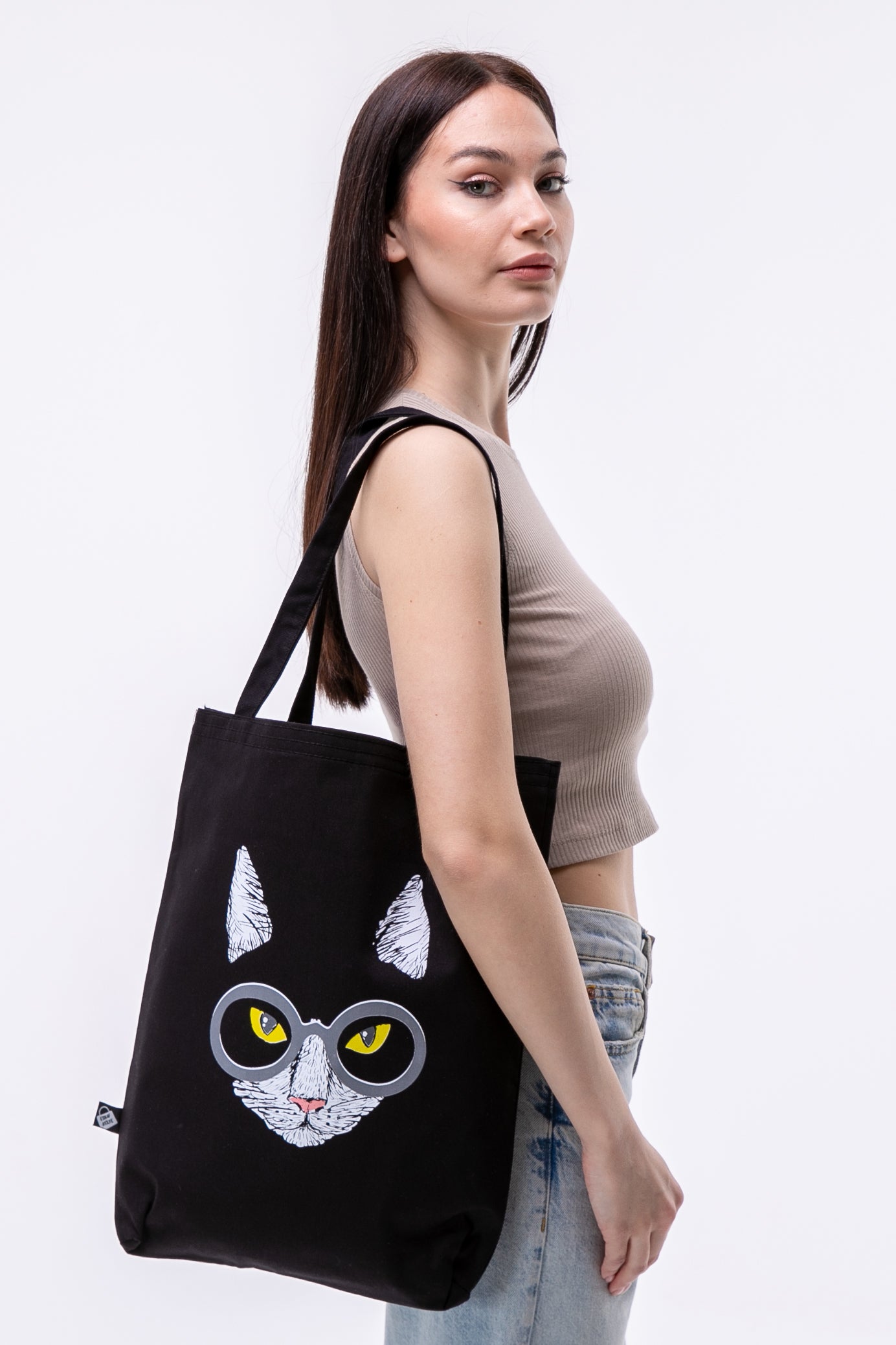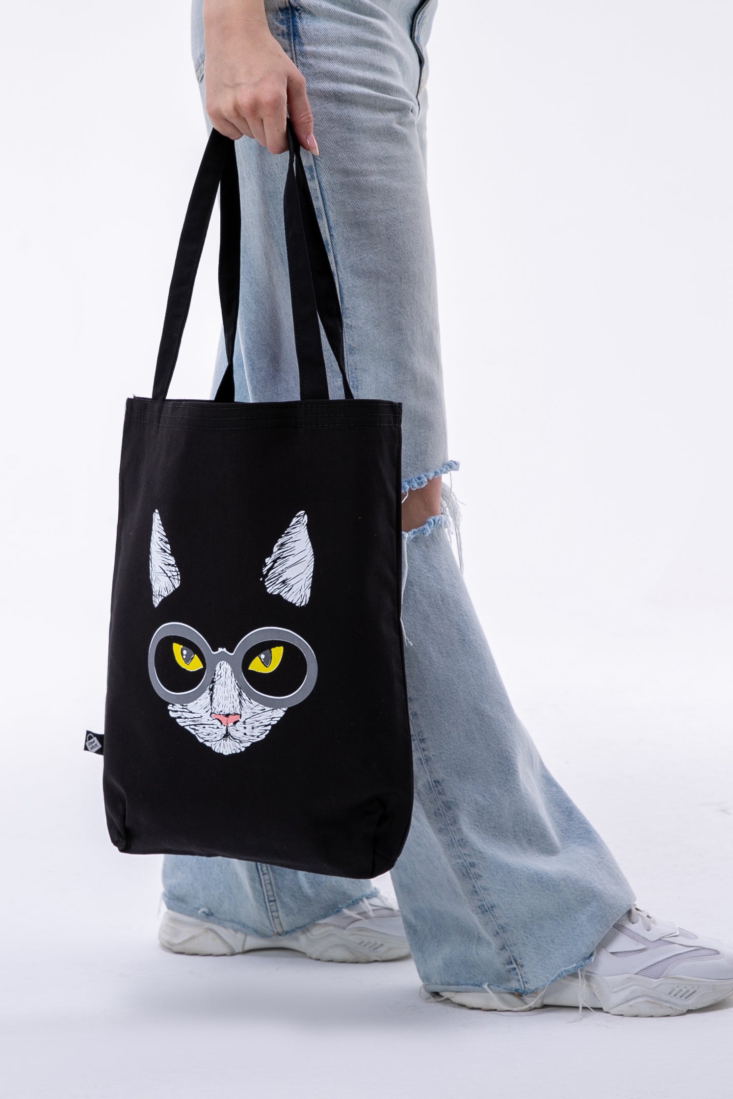Yeşil Gözlü Kedi 340gr Siyah Gabardin Kumaş 35x40x8cm Bez Çanta